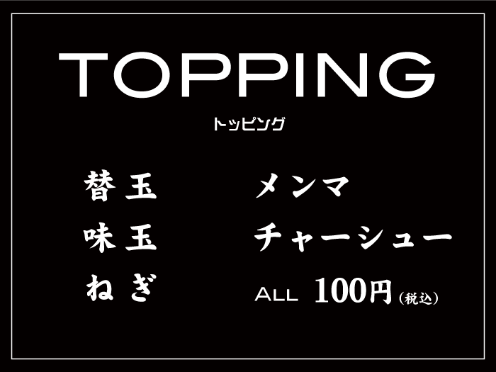 チャシュー、メンマ、キクラゲ、味玉、ネギ、海苔と鶴亀堂こだわりの食材を全部トッピングしたボリューム満点の一品。